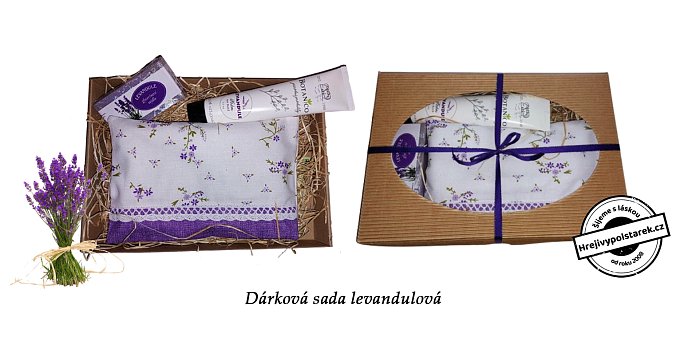 Sada obsahuje: Nahřívací pohankvý polštářek cca 14x20cm s vůní levandule. Levandulový krém na ruce. Velké levandulové mýdlo. Fialovo zlatou stužku. Dárkovou krabičku s okýnkem. zobrazit více