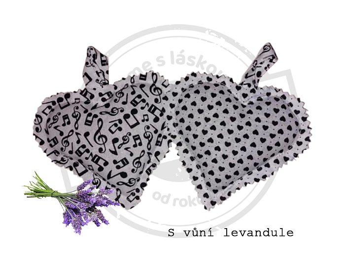 Dekorační levandulový polštářek srdíčko noty / srdíčka
