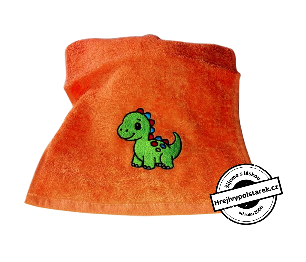 Cena je za jeden oranžový ručník s výšivkou dinosaura.