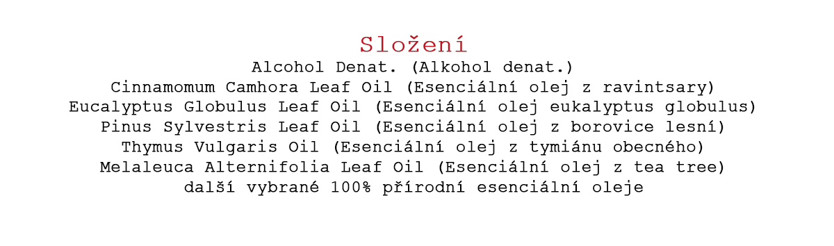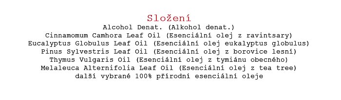 Obsahuje: Eukalyptový olej, limonen, kafrový olej, borovicový olej, thyme oil.